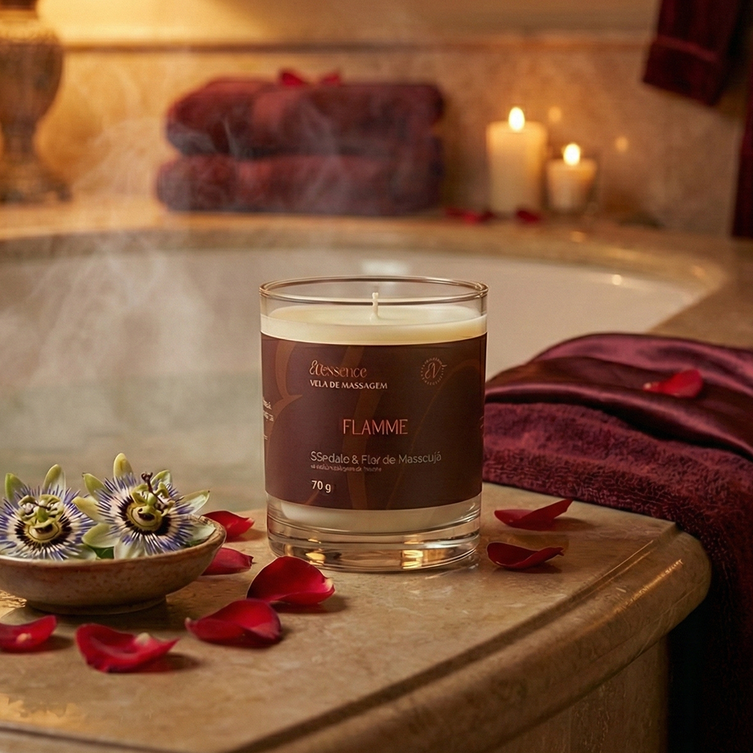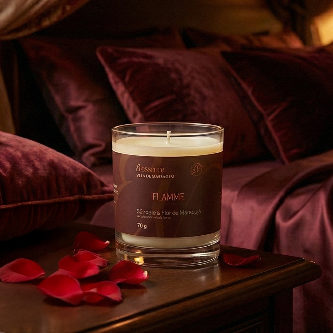 Descubra a Vela Flamme – Evessence: a união perfeita entre calor e sedução. Desenvolvemos um blend exclusivo que derrete na temperatura ideal para a pele, criando uma atmosfera de intimidade imediata. A sinergia entre o Óleo de Coco e a Manteiga de Cacau garante um toque de seda, sem pegajosidade.
